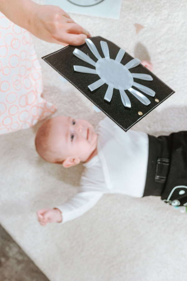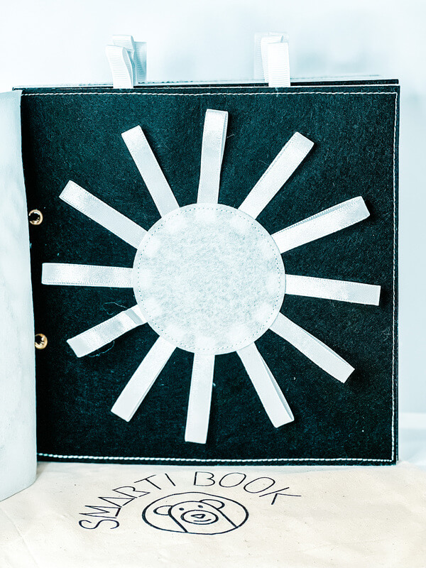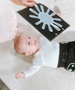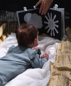The Black&White Book conține 7 pagini într-o combinație de culori alb-negru, motiv pentru care este numită și carte de contrast, deoarece nou-născuții disting acest lucru în primul rând. În primul rând, un nou-născut distinge între lumină și întuneric și învață să se concentreze asupra unui anumit obiect și să-și păstreze privirea asupra lui. Știați că, cu cât informația vizuală unno-născutul primește mai precisă, cu atât dezvoltarea creierului este mai stimulată? De aceea, se recomanda umplerea mediului copilului cu contraste alb-negru inca de la nastere, astfel incat copilul sa primeasca semnale timpurii din mediu care sa-i stimuleze dezvoltarea cognitiva. Black&White Book cu contrast ridicat este o idee excelentă pentru prima jucărie a unui copil. Toate paginile broșurii sunt detașabile și pot fi atașate orizontal pe un pătuț sau covoraș de joacă, pe un cărucior sau pur și simplu individual în mașină. Fiecare pagină oferă diferite materiale pe care copilul să le atingă, încurajând dezvoltarea senzorială. Am conceput broșura pentru nou-născuți pentru a încuraja dezvoltarea lor senzorială și vizuală cu imagini cu contrast ridicat ale animalelor și obiectelor. Fiecare pagină este echipată cu materiale diferite pe care bebelușul le poate atinge, deoarece bebelușilor le place foarte mult să exploreze lucruri necunoscute, cum ar fi imagini și materiale noi.