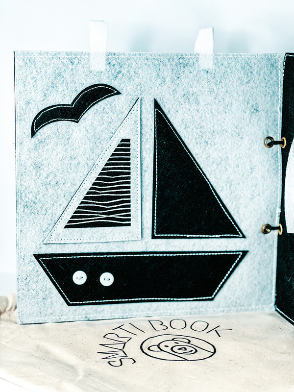 Barcă cu vele: O barcă cu pânze mare plină de contraste alb-negru. Copilul poate simți diferența dintre pânze. Există și două butoane în partea de jos.