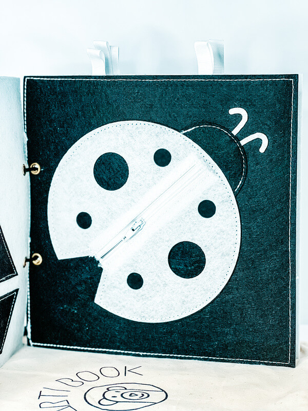 BURUZĂ: O gărgăriță oarecum neobișnuită alb-negru nu are doar puncte negre prin care copilul poate glisa un deget, ci și un fermoar. Fermoarul emite un sunet foarte interesant și este, de asemenea, grozav la atingere.