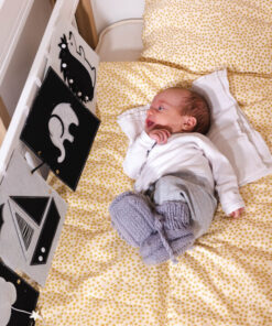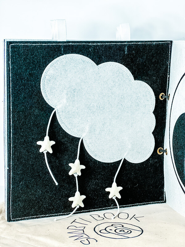 CLOUD: Norul este grozav la atingere, deoarece are o plasă peste pâslă, care face, de asemenea, un sunet foarte plăcut pentru nou-născuți (asemănător cu foșnetul). În plus, șiruri cu stele atârnă din nor. Pe lângă observație, bebelușul poate atinge totul.