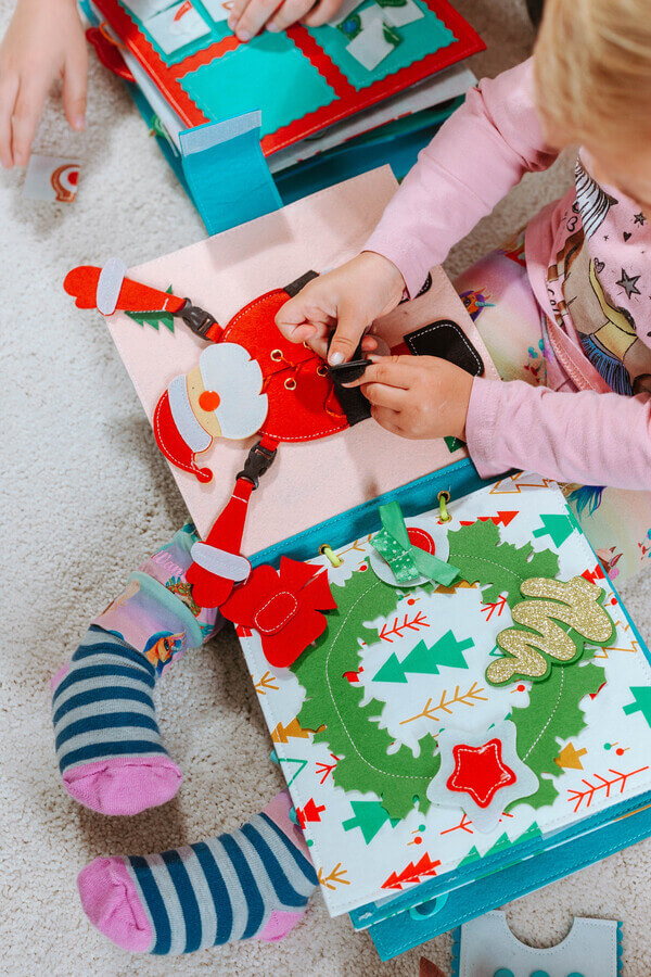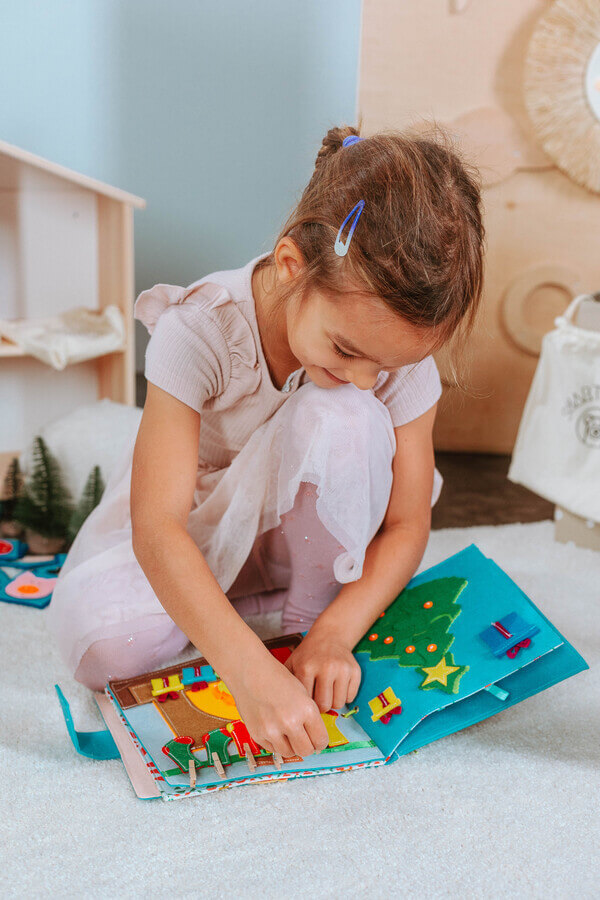 Abilități motorii fine: copiii își dezvoltă abilități precum folosirea degetelor și a mâinilor pentru a opera diverse elemente interactive, cum ar fi fermoare, nasturi, șireturi etc. în Quiet Book.
